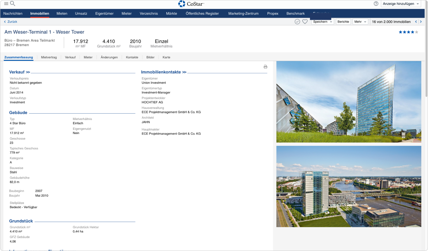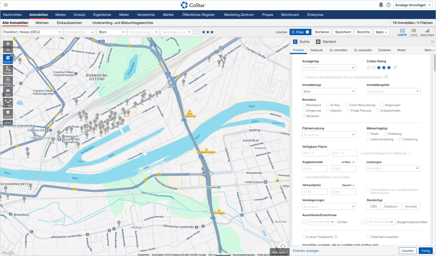 CoStar ist der Ort, an dem gewerbliche Immobiliengeschäfte getätigt werden. Holen Sie sich den Zugang auf bis zu 1 Mio. Anzeigen von Gewerbeimmobilien, die zur Vermietung und zum Verkauf stehen, sowie zu Online-Auktionen von Ten-X und einer Welt von Investitionsmöglichkeiten auch außerhalb des Marktes.