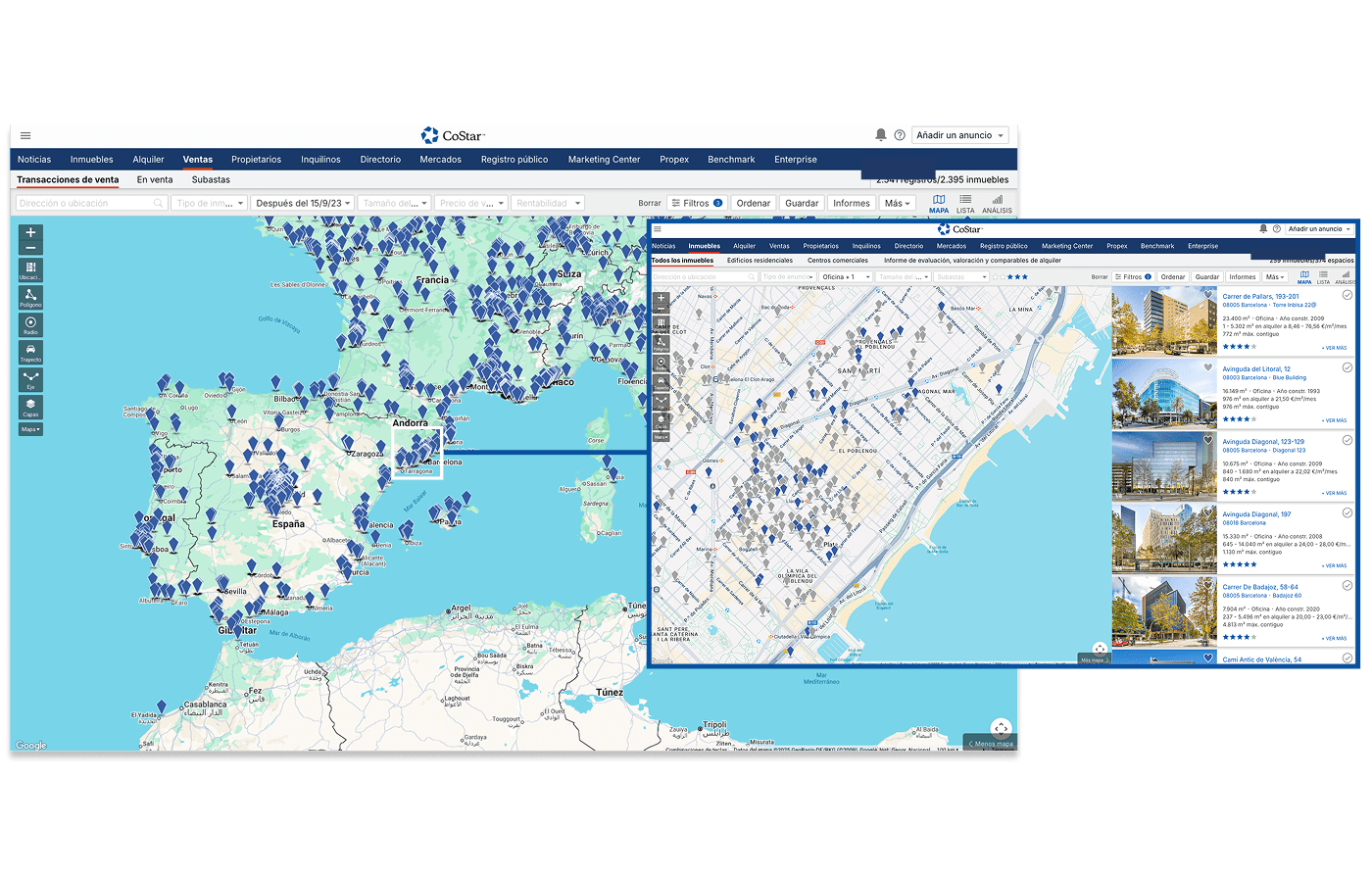 La plataforma de CoStar es muy intuitiva y permite encontrar y consultar fácilmente información detallada sobre los contratos de venta de oficinas, locales, naves, suelos y otros inmuebles terciarios. Localiza y analiza rápidamente datos verificados de forma independiente sobre detalles clave, como la fecha de venta, el precio de salida y final, el tiempo en el mercado o notas completas de la venta.