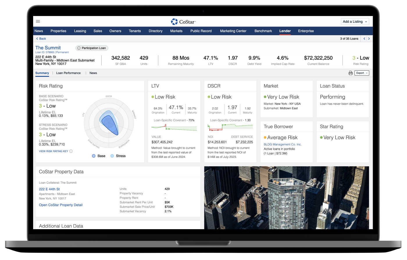 Disponer de acceso permanente a los datos y análisis de CoStar te permite tomar mejores decisiones en cuanto a los orígenes y carteras de préstamos con más rapidez.