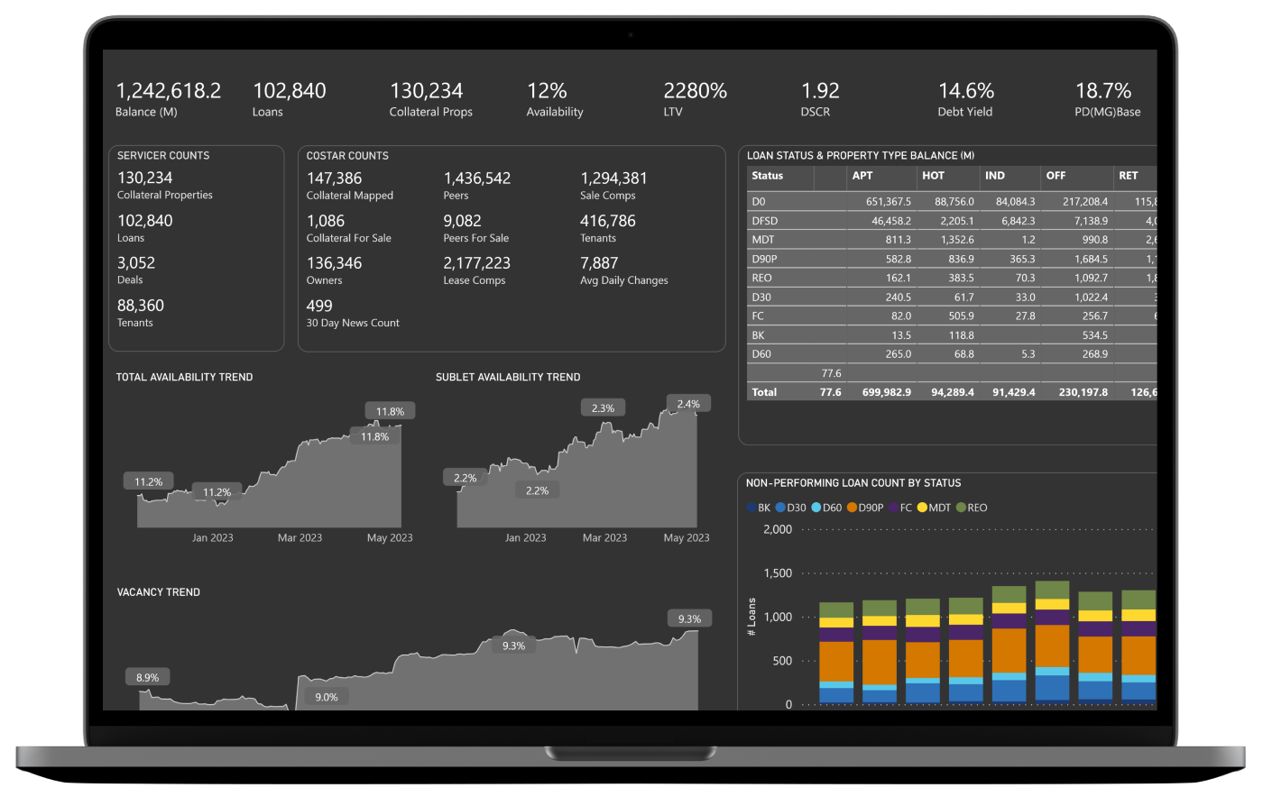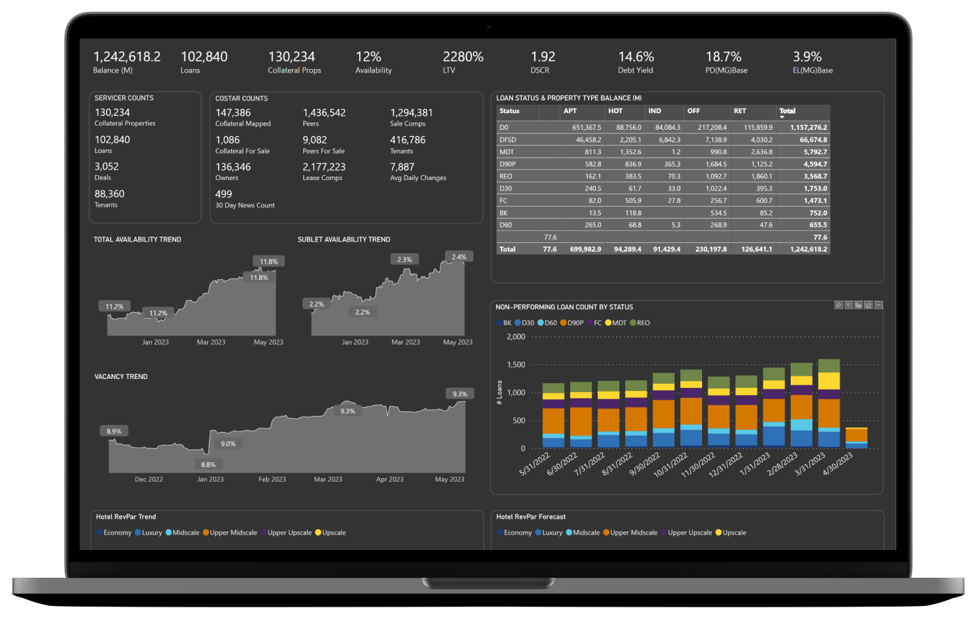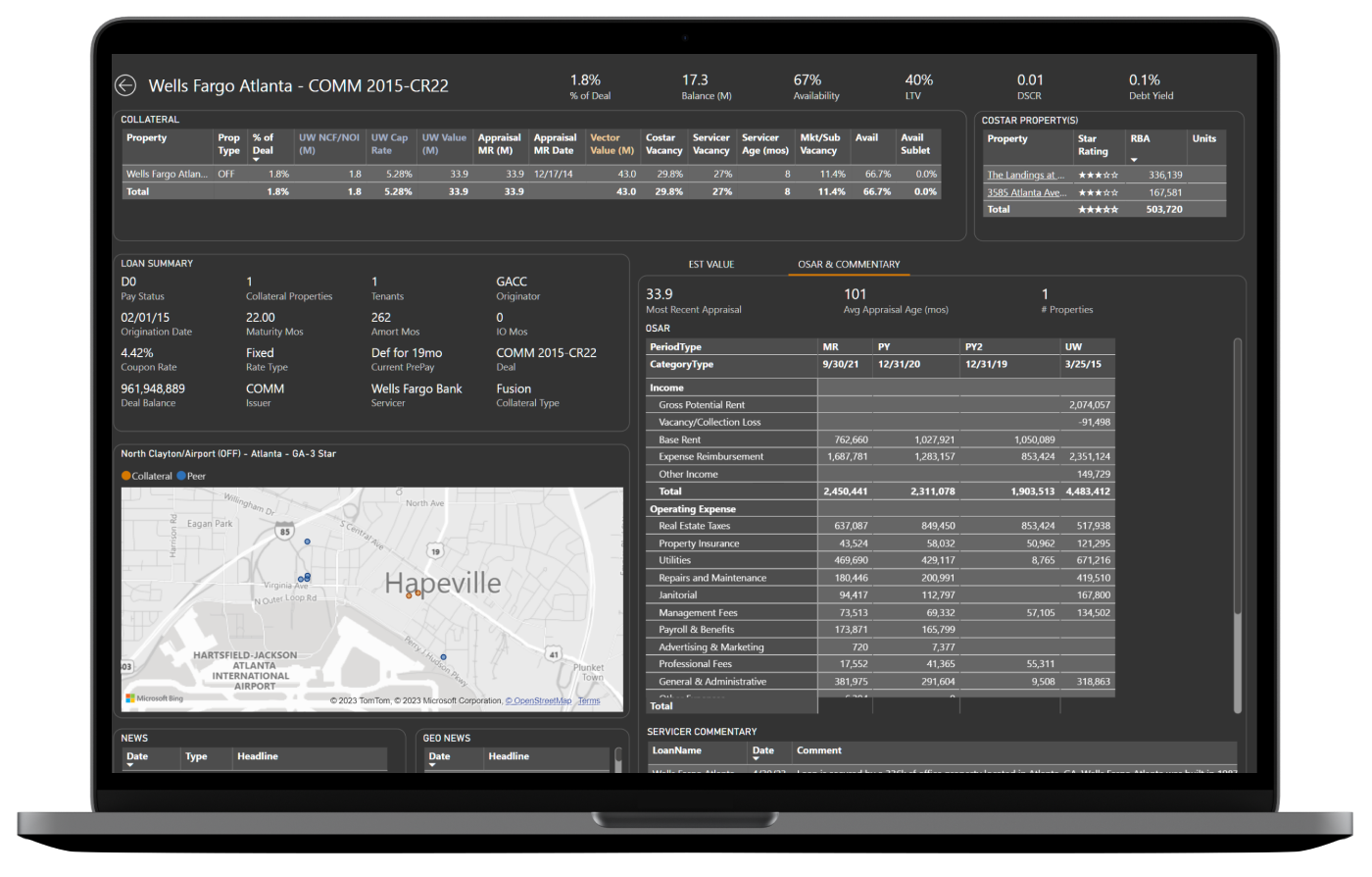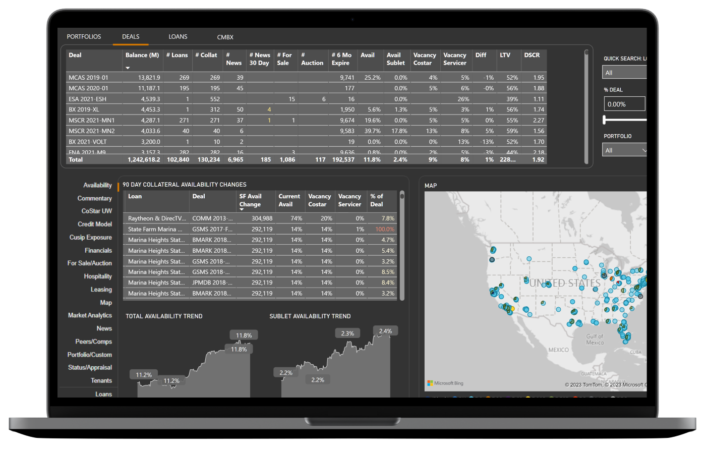 Una plataforma integral para inversores en CMBS que combina los datos CMBS de INTEX, los datos inmobiliarios líderes del sector de Costar, análisis de mercado y el modelo COMPASS de incumplimiento crediticio, todo ello asignado directamente a cada una de tus operaciones CMBS, préstamos e inmuebles en garantía.
