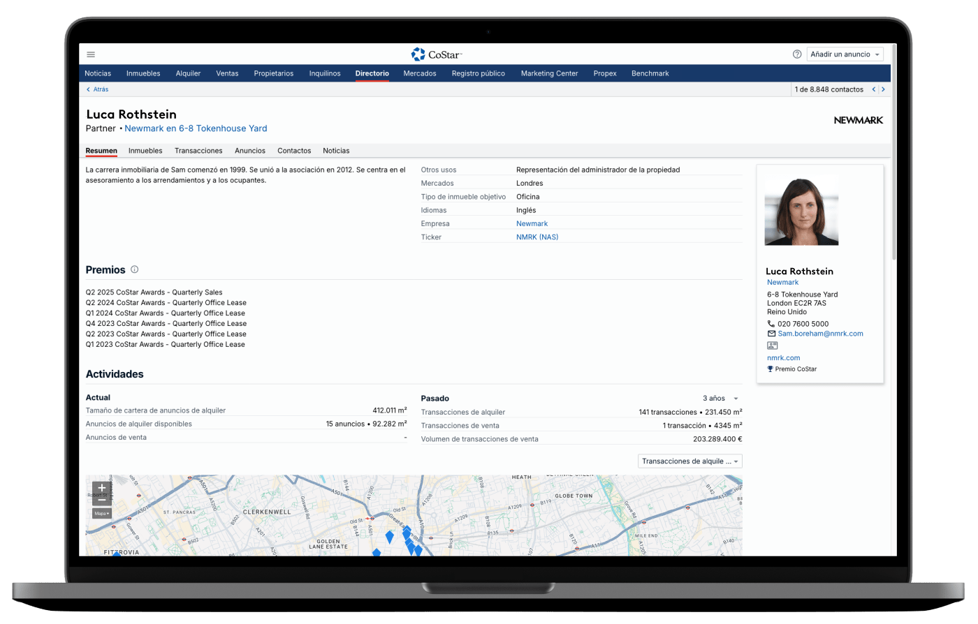 Comuníquese con profesionales del sector de bienes raíces comerciales para identificar nuevas oportunidades. Busque contactos, ubicaciones o empresas en función de su especialidad, conocimiento del tipo de propiedad, experiencia en transacciones, número de anuncios activos, mercados cubiertos, premios CoStar ganados, etc.