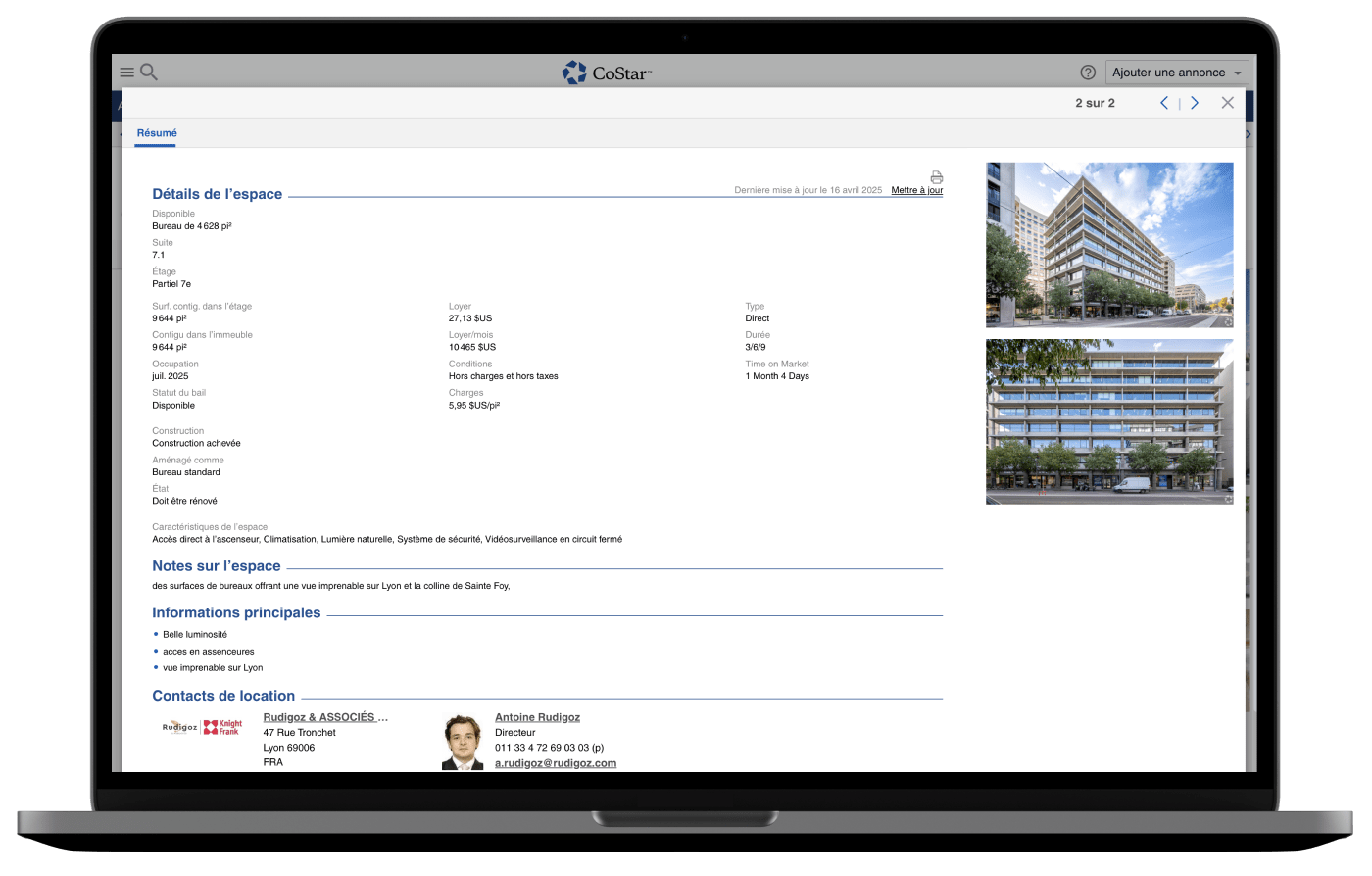 CoStar vérifie de façon indépendante les locations de locaux commerciaux, mettant à votre disposition une vaste base de données de comps de location. Chaque comparable est connecté aux données sur les immeubles, aux photos, aux informations sur les locataires et les propriétaires, et autres données de CoStar.