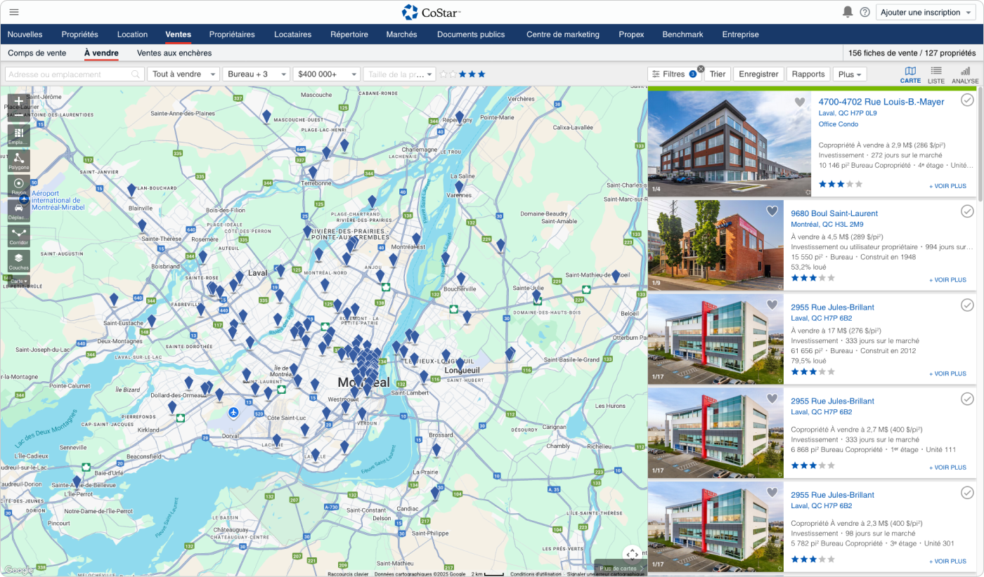 CoStar vous connecte à un réseau mondial de propriétés commerciales à vendre et à louer. Consultez toutes les inscriptions de nos places de marché comme LoopNet, Showcase et CityFeet, ainsi que les enchères à venir de notre plateforme d’échange, Ten-X. Accédez à des milliers d’inscriptions supplémentaires qui apparaissent exclusivement sur CoStar.