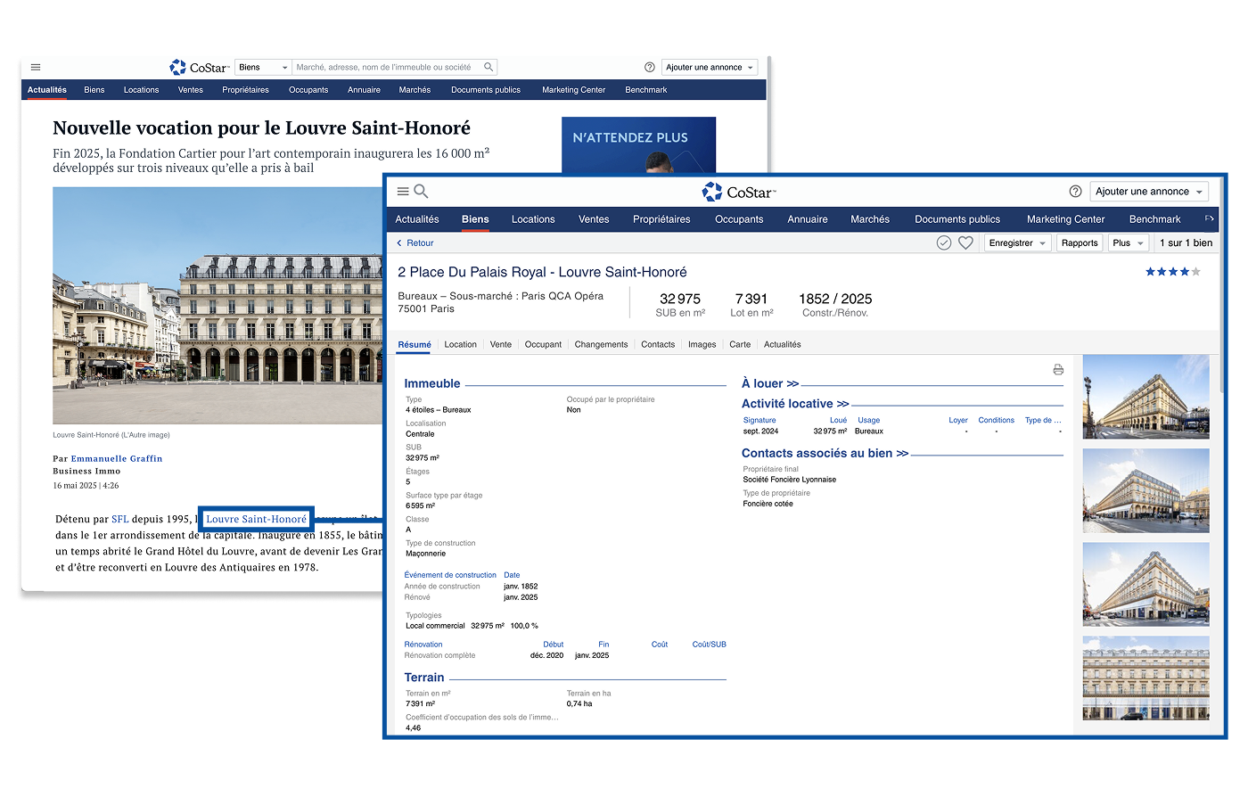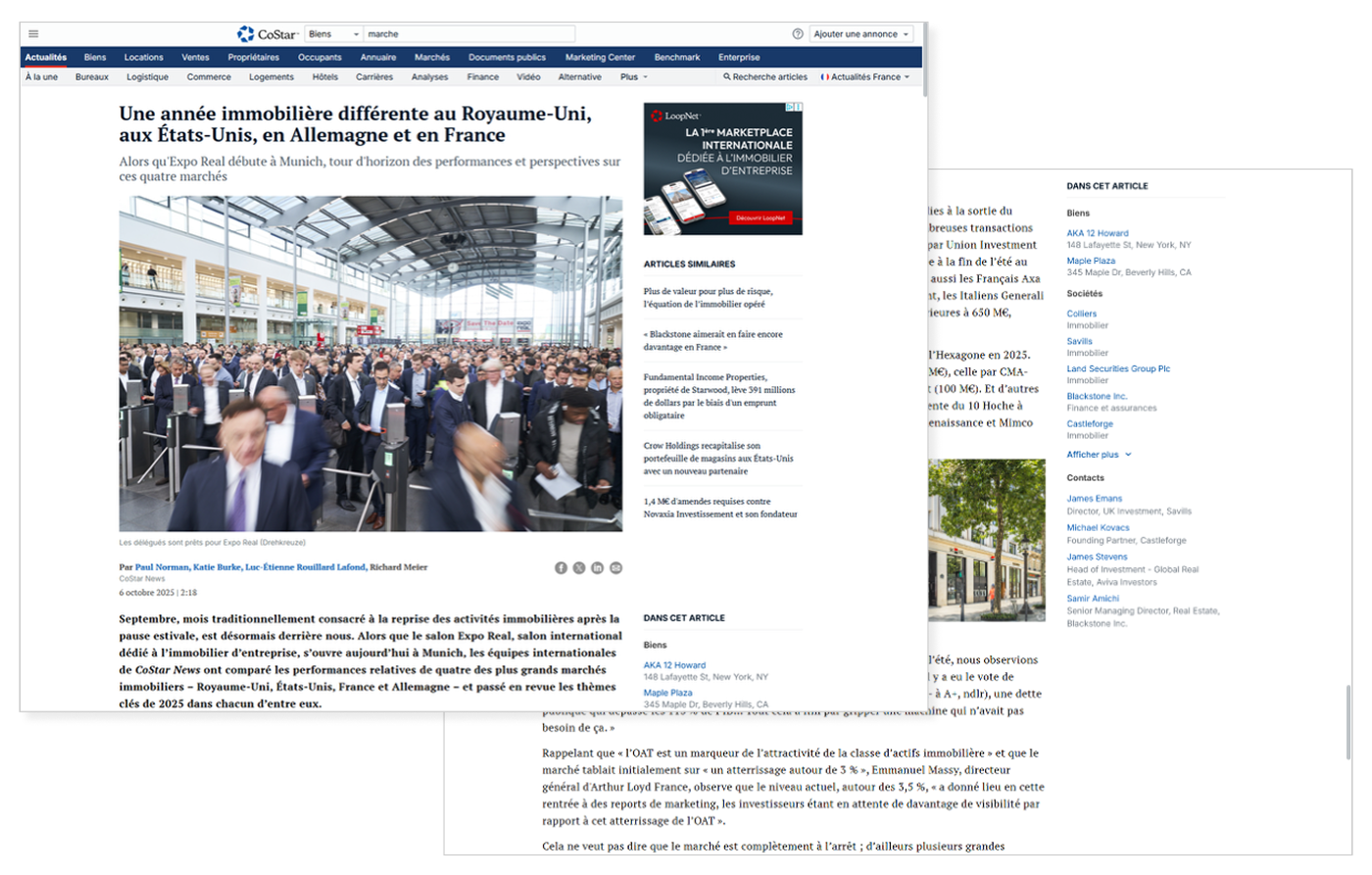 L’équipe éditoriale de CoStar vous livre des actualités et analyses appuyées sur ses données exclusives. Grâce aux liens vers les fiches immobilières, explorez en un clic les tendances du marché et les détails des transactions, directement depuis l’article.