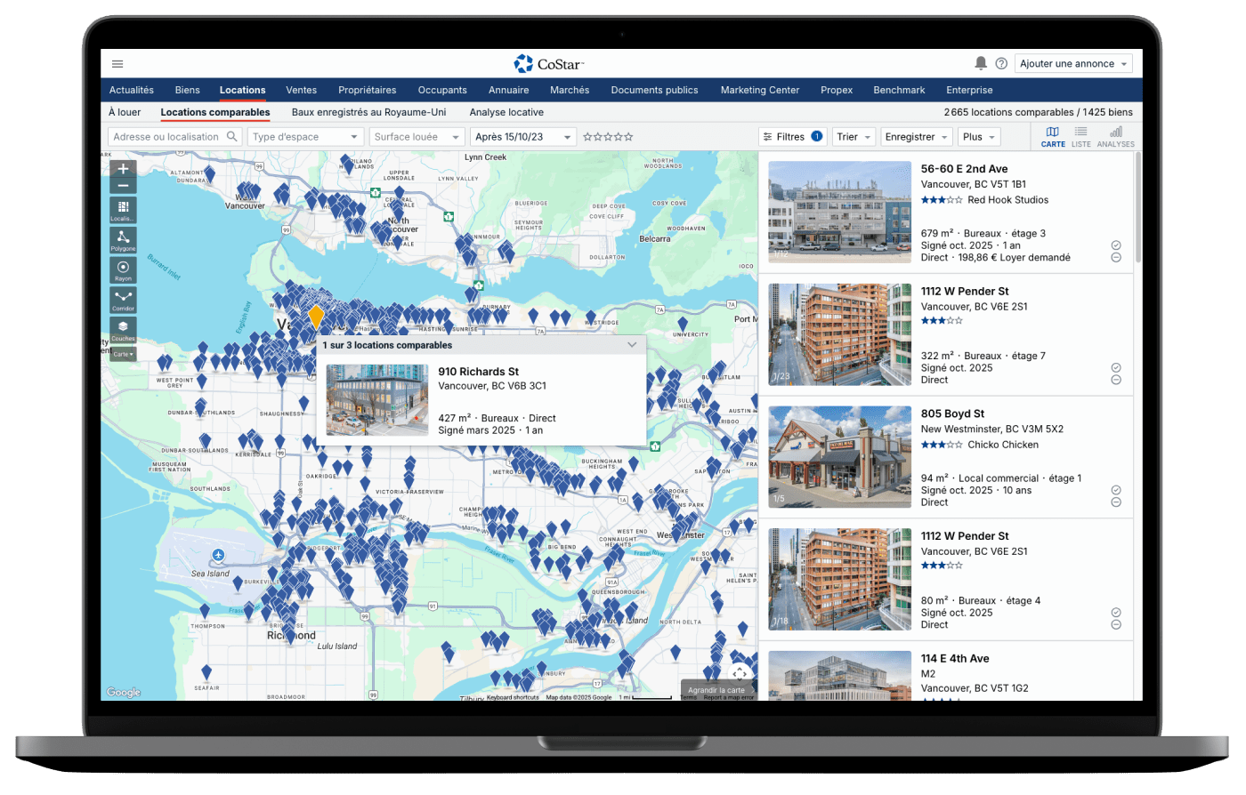 CoStar certifie de manière indépendante les locations de biens professionnels, vous offrant ainsi un accès privilégié à une vaste base de comparables. Chaque référence est enrichie par des données détaillées sur les immeubles, des photos haute définition, ainsi que des informations complètes sur les occupants, les propriétaires et toutes les données disponibles sur CoStar.
