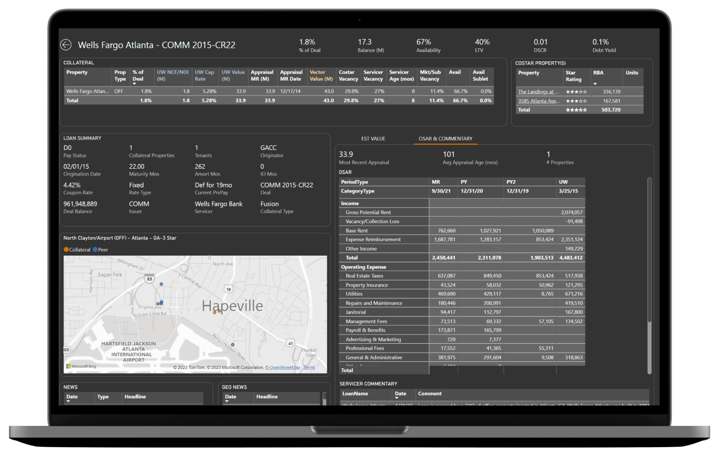 Une plateforme CMBS tout-en-un qui combine les données CMBS d’INTEX, les informations immobilières de CoStar, ses analyses de marché, et le modèle de risque de crédit COMPASS, pour connecter directement chacune de vos transactions, prêts et garanties.