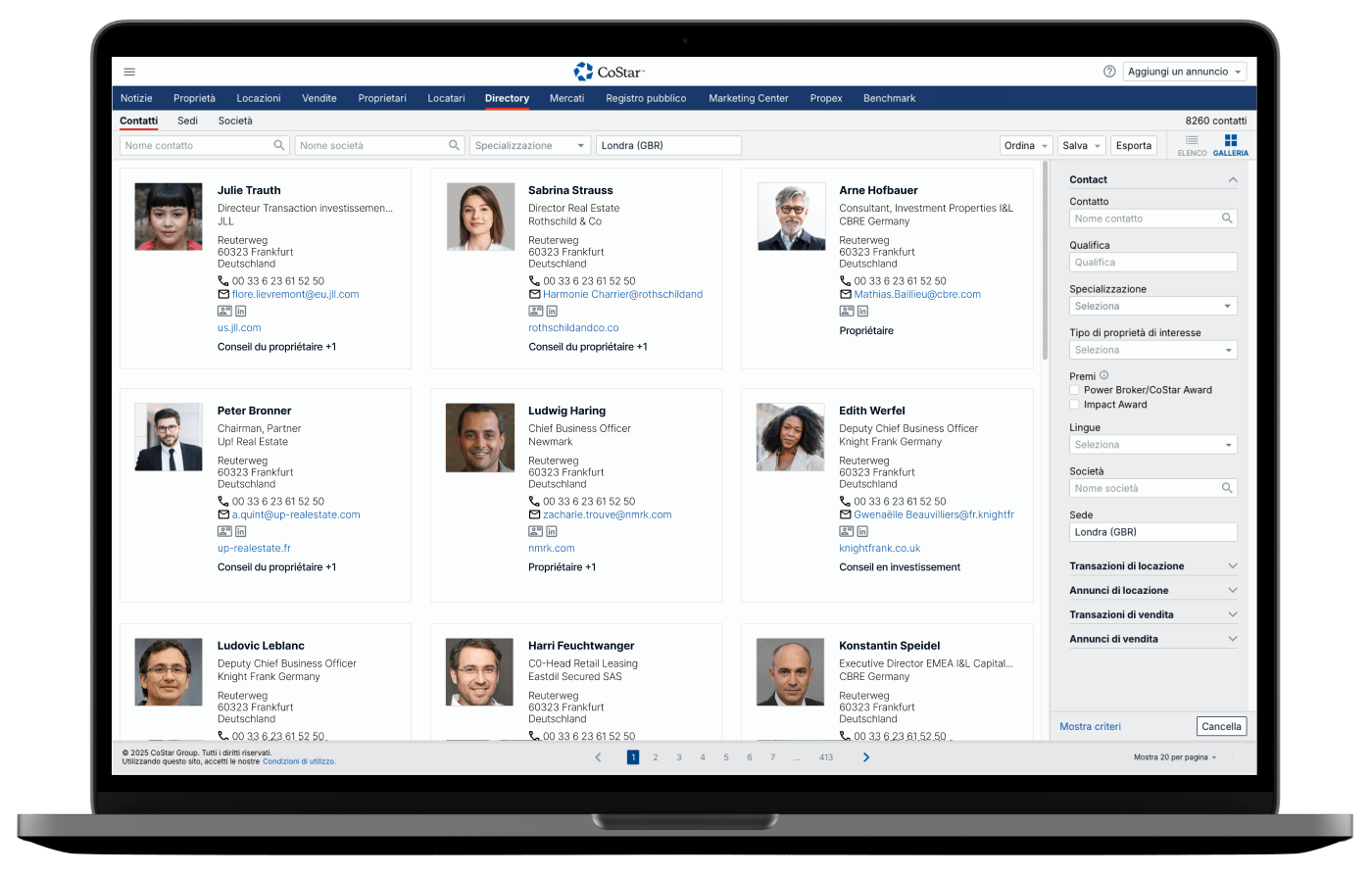 Entra in contatto con i professionisti del settore immobiliare commerciale per individuare nuove opportunità. Cerca contatti, sedi o società per specializzazione, tipo di competenze o transazioni, numero di annunci attuali, mercati di interesse, premi CoStar vinti e molto altro ancora.