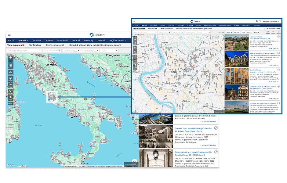 Filtra i dati delle proprietà per trovare immobili disponibili, edifici in vendita, contratti di locazione in scadenza e opportunità di riqualificazione.