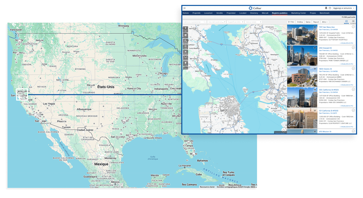 Utilizza i nostri potenti filtri di ricerca per identificare rapidamente e con facilità i terreni e gli immobili di tuo interesse. Consulta i dati dettagliati dei registri pubblici, integrati da CoStar con fotografie di alta qualità degli immobili, immagini satellitari e confini fondiari.
