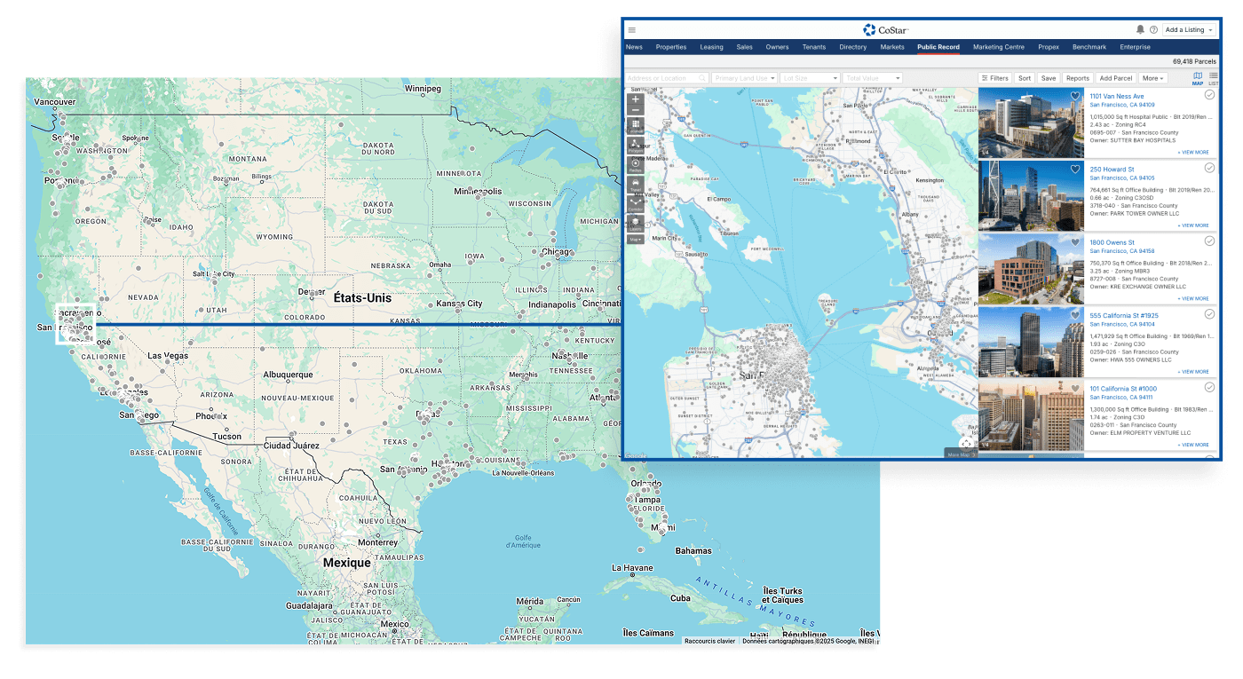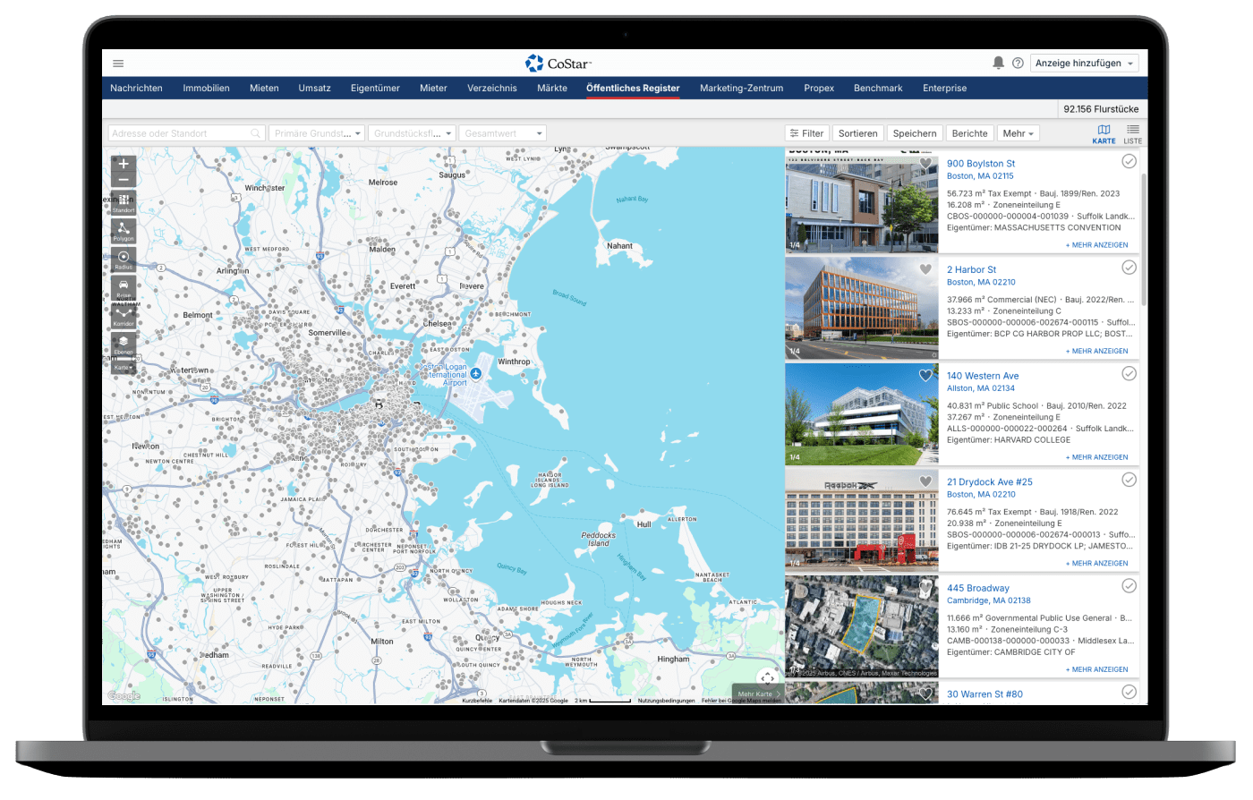 Das öffentliche Register von CoStar bietet Ihnen Zugriff auf 42 Millionen Einträge zu Gewerbeimmobilien, sodass Sie ganz einfach öffentliche Informationen zu jedem Gewerbeobjekt oder Grundstück aus mehreren Jahrzehnten abrufen können.