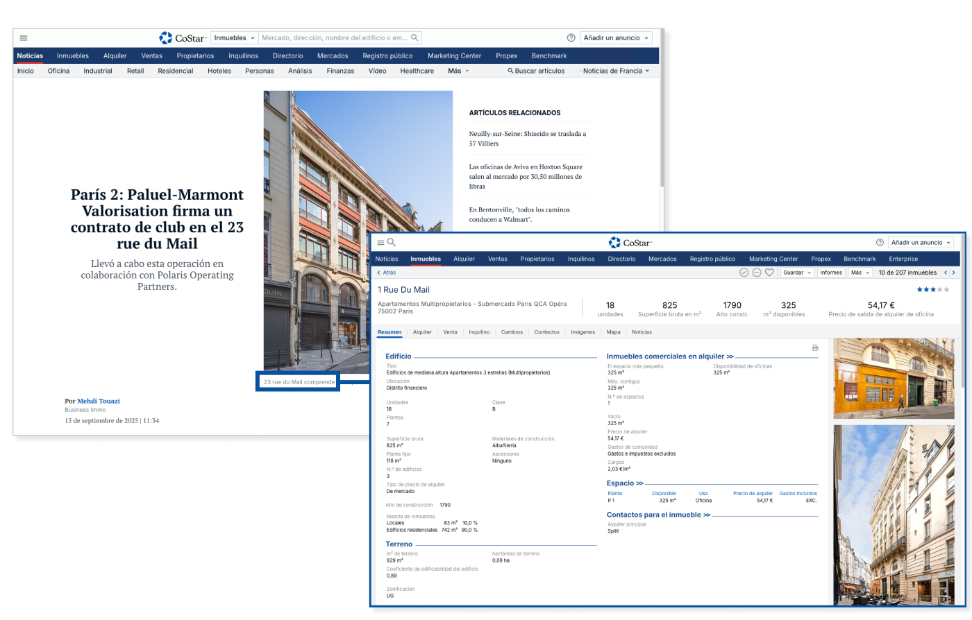 Podrás ver los artículos relacionados directamente en la información sobre mercados e inmuebles de CoStar.