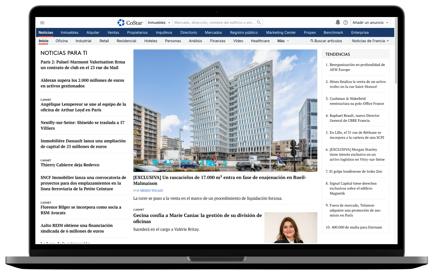 Las noticias de CoStar ofrecen una cobertura exhaustiva y basada en datos de todos los sectores, mercados, transacciones y responsables de negocios que impulsan el sector de oficinas, locales, naves, terrenos y otros inmuebles terciarios.