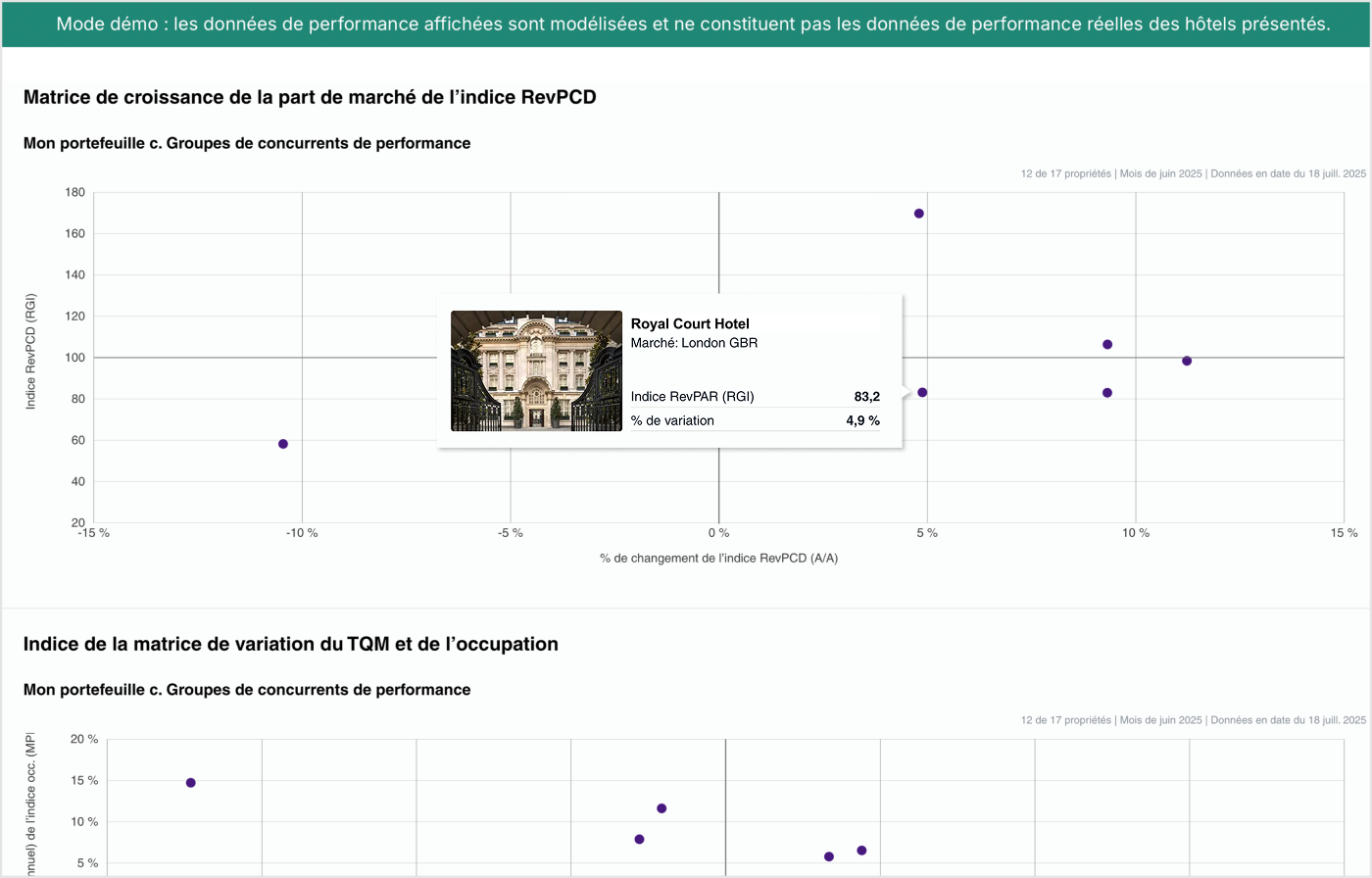 Montrez aux propriétaires l’équilibre nécessaire entre le taux d’occupation et les tarifs pour devancer la concurrence et augmenter les profits. Analysez le rendement des portefeuilles avec la possibilité d’approfondir l’analyse de regroupements ou de groupes particuliers.