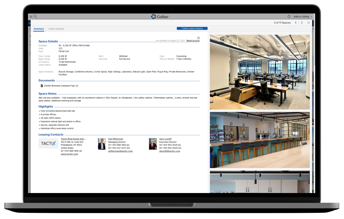 CoStar independently verifies commercial real estate leases, putting a vast database of lease comparables at your fingertips for analysis. Every comp is connected to CoStar building data, photos, tenant and owner information and more.
