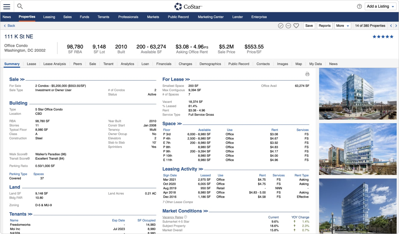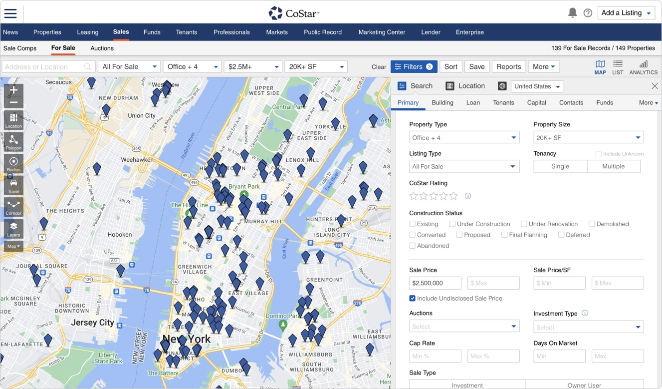 CoStar is your connection to a global network of commercial property for lease and for sale. See everything listed on our marketplaces like LoopNet, Showcase and CityFeet, plus every upcoming auction from our online exchange platform, Ten-X. Access thousands more listings which appear exclusively in CoStar.