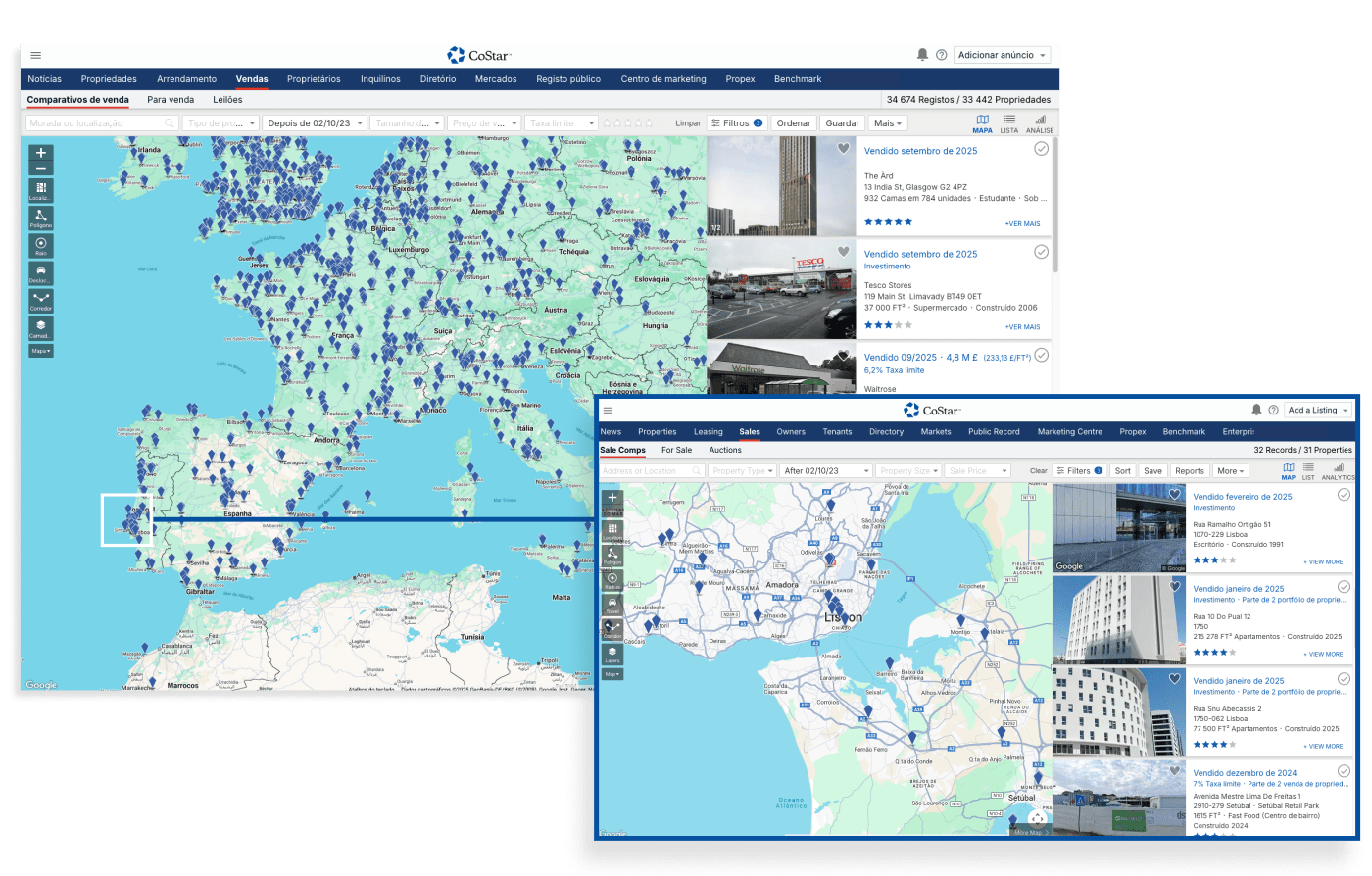 Os comparativos de venda estão associados a uma grande quantidade de dados da CoStar sobre inquilinos, vagas, anúncios de venda e muito mais.