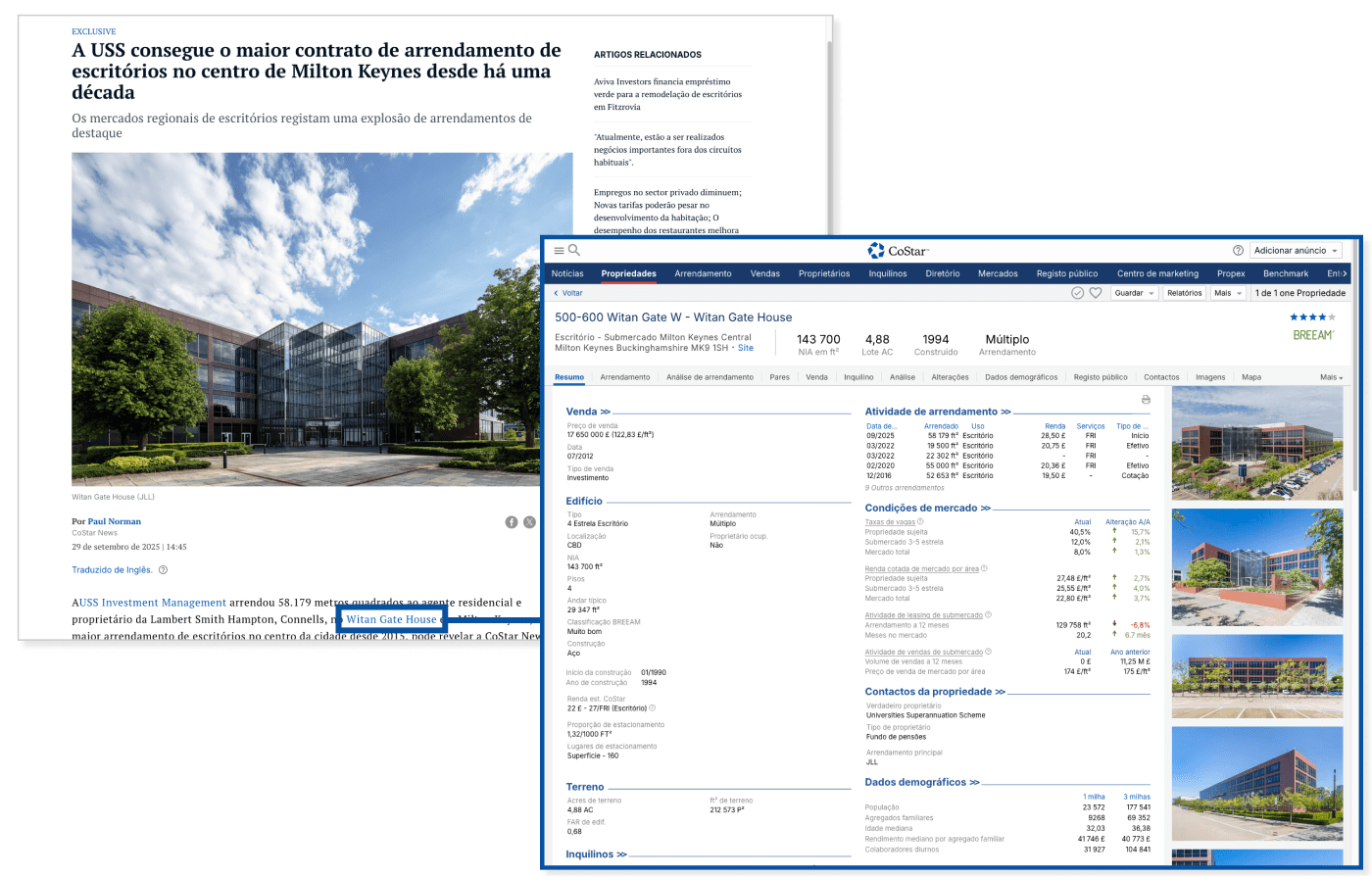 A equipa de notícias da CoStar traz-lhe artigos e análises baseados em informações dos dados de mercado da CoStar. E com os artigos de notícias a ligarem-se diretamente aos registos de propriedade subjacentes, pode passar facilmente das notícias para os dados de mercado profundos na mesma vista.