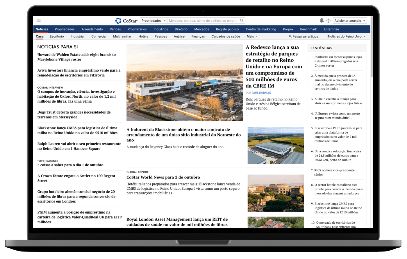 As notícias da CoStar fornecem uma cobertura abrangente, baseada em dados, dos setores, mercados, transações e negociantes que impulsionam o imobiliário comercial.