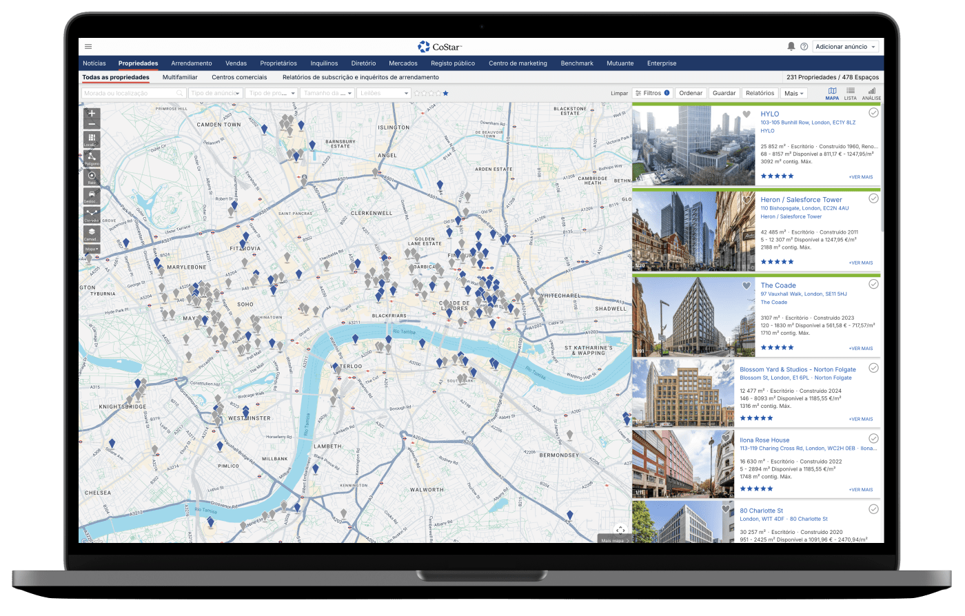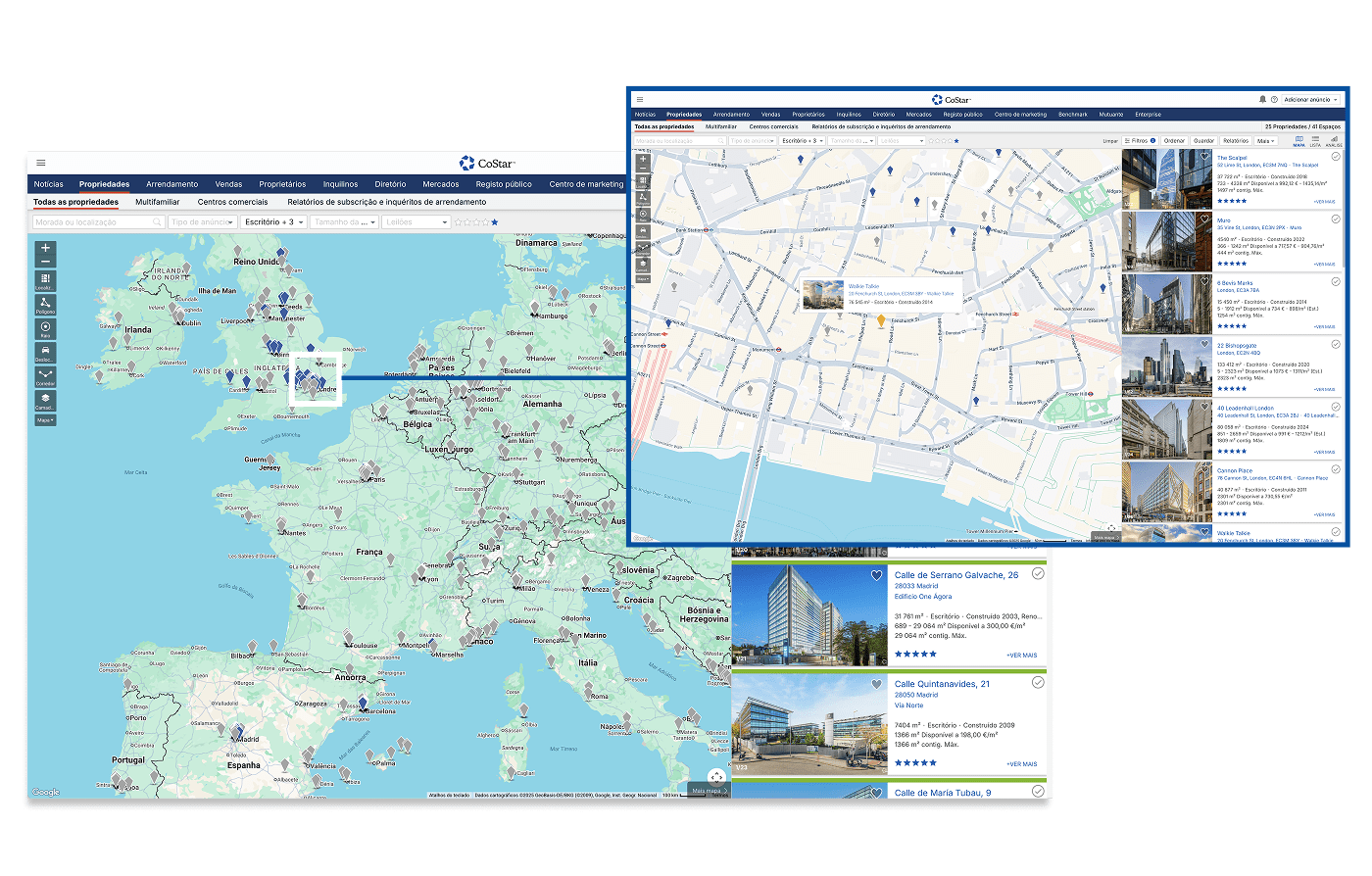 Os dados de propriedades da CoStar colocam-no tão perto dos edifícios que é como estar no átrio. A partir de uma única pesquisa, explore um mundo de informações detalhadas sobre propriedades comerciais em diferentes tipos de ativos, mercados e países.