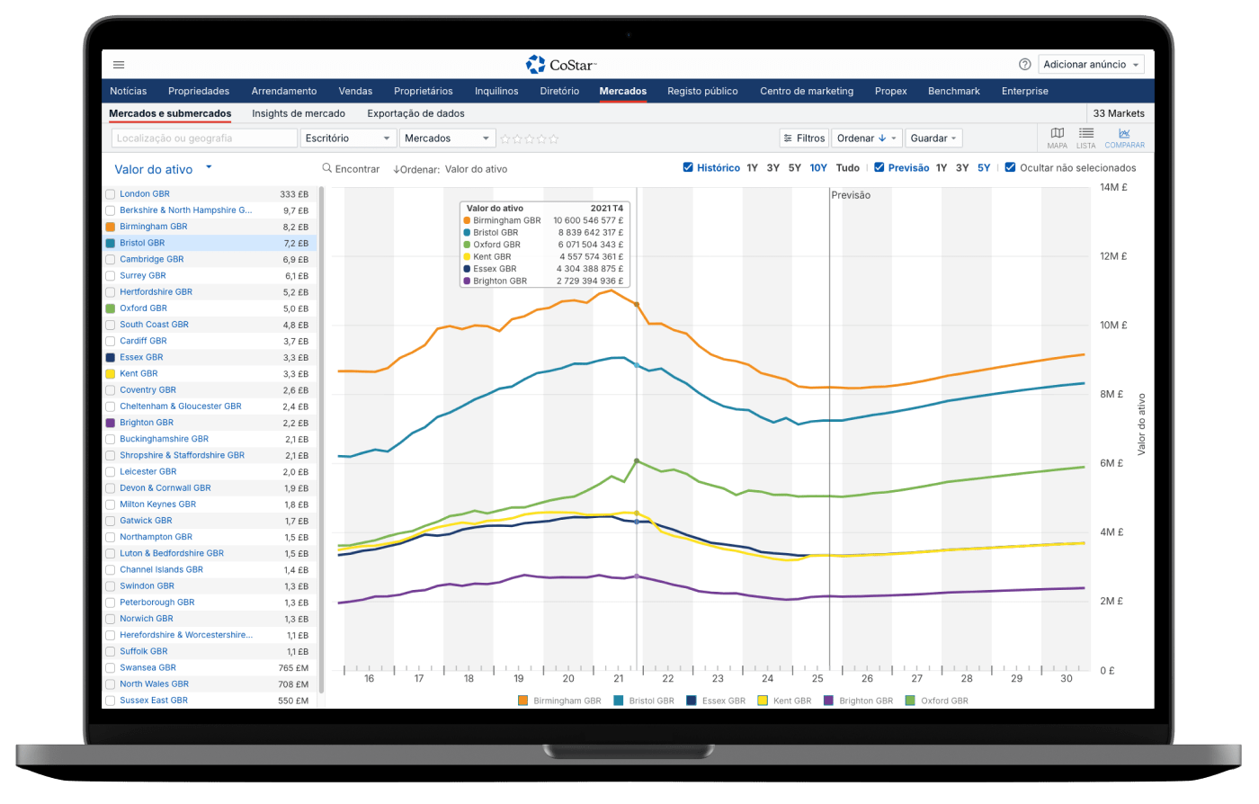 Gráficos de análise e relatórios de mercados e submercados