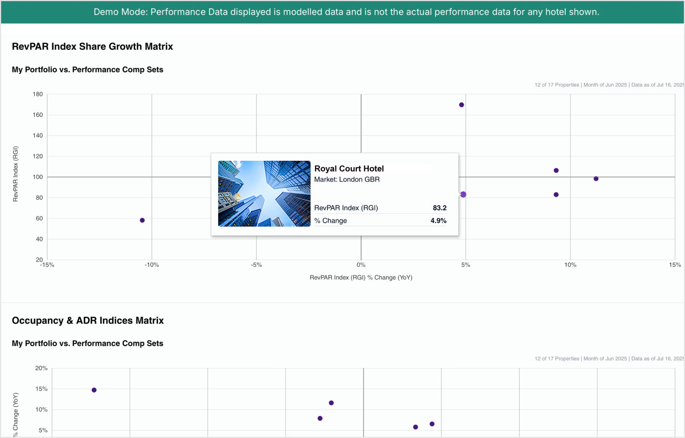 Illustrate to owners the necessary balance between occupancy and rates to outperform competitors and increase profits. Analyze portfolio performance with the capability to delve into specific clusters or groupings.